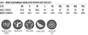 Material: Shell – 400D Certified Recycled PET, 56gsm. Insulation – 100% Certified Recycled PET, 100gsm. Lining – 230T Polyester Taffeta.